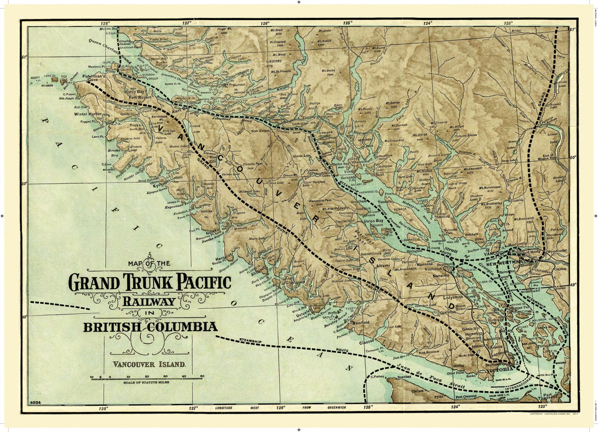 Cartolina Vintage Map Grand Trunk Pacific Railway on Vancouver Islan